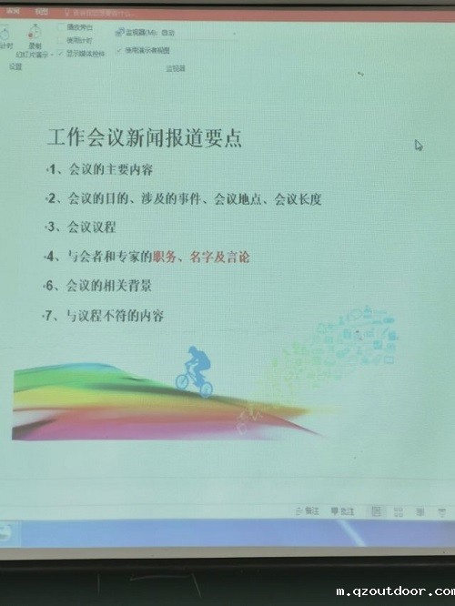 首先由会长助理李贤旭介绍会议目的,宣布会议开始。随后,邀请刘庆辉同学上台进行新闻专项培训。刘庆辉上台进行自我介绍并演示PPT讲解如何写好新闻新闻专项培训主要包括四部分。一是介绍什么是新闻,新闻的特点及定义;二是新闻由标题、导语、正文、结语组成,并简单介绍各部分的要求;三是怎样写好一篇引人眼球的新闻。该部分又分为两小部分,其中一小部分是举例时下权威媒体的热点实践新闻报道,将新闻四要素逐个分析,干事们明白一篇合格的新闻是什么样子;另一小部分则是具体提高新闻写作的方法,并用一句话概括为“看报看报再看报。四是列举新闻创作中应注意的事项,包括新闻的格式,谦敬词褒贬词的运用,行文中的禁忌及图片要求。