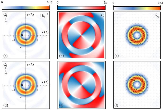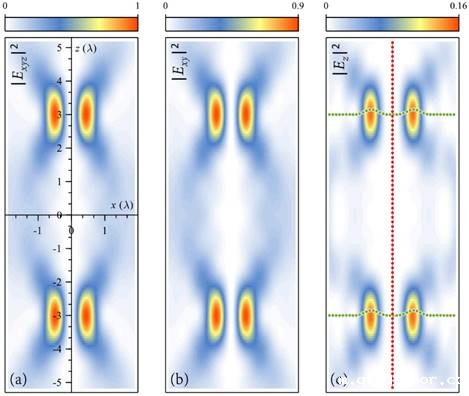 图2 定制的Pancharatnam–Berry相位导致的自旋分裂。(a)总强度;(b) 横向分量;(c) 纵向分量。