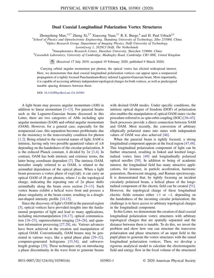 近日,我院青年教师满忠胜副教授在光子轨道角动量研究领域获得突破性进展,相关成果以“Dual Coaxial Longitudinal Polarization Vortex Structures”为题发表于国际物理领域顶级期刊《Physical Review Letters》(物理评论快报)上。该研究成果为满忠胜副教授与深圳大学长江学者袁小聪教授、英国剑桥大学卡文迪许实验室R. E. Burge教授以及荷兰代尔夫特理工大学欧洲光学学会主席H. P. Urbach教授合作完成。论文首位作者为我院满忠胜副教授,山东理工大学为第一完成单位。