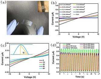 4. (a) ITO-PET衬底上基于CsPb2Br5纳米片的光电探测器的光学图像。插图:CsPb2Br5纳米片的光学图像。标尺是50 μm(b) CsPb2Br5纳米片用405 nm波长激光在不同入射光功率下的I-V特性。(c)在不同弯曲角度下测量的I-V特性。插图:弯曲实验示意图。(d)折弯50/100 /200/300/500次前后测得的器件随时间变化的光响应。