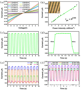 3 (a)基于CsPb2Br5纳米片的光电探测器在不同入射光功率下的I-V特性。(b)偏置电压为5V时,光电流对光功率密度的依赖关系。插图:制作好的光电探测器的显微镜图像。(c)光强为7.33 mW mm-2、偏置电压为5 V405 nm激光照射下的时变光电流测量。(d)光电流上升和下降时间。(e)不同电压下的I-T测量,光强为7.33 mW mm-2(f) CsPb2Br5纳米薄片在室温空气中的稳定性测定