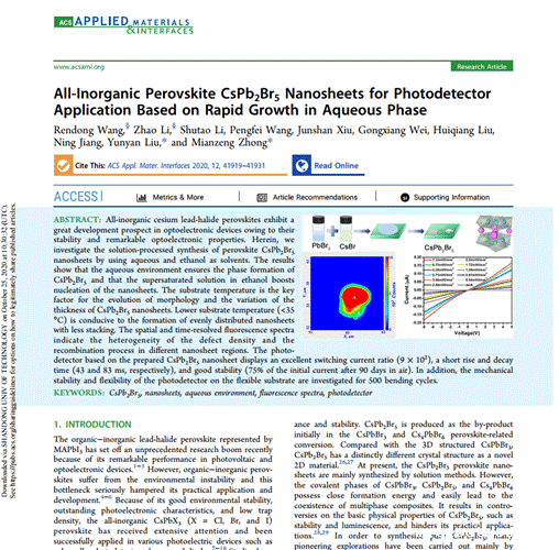 近日,我院先进成像与数据挖掘实验室研究生王仁东在微纳光电探测器研究方面取得新进展,无需昂贵的真空气相沉积系统,该研究采用环境友好的溶剂在固体基底上生长了CsPb2Br5纳米片,通过温度调控解决一般溶液法制备导致的纳米片堆聚问题,而且避免了油胺等有机分子的存在阻碍载流子传输的问题。研究表明,这种方法可以成功在各种材质基底上生长均匀纳米片,较低的生长温度更加其均匀性。空间和时间分辨荧光测量揭示纳米片在不同微区内荧光强度分布和缺陷状态。基于CsPb2Br5纳米片的光电探测器和柔性探测器表现出良好的光电性能和稳定性。制造的光电探测器具有9×102的大开/关比,响应速度快,恢复时间分别为4383 ms。并首次制备金字塔形的CsPb2Br5纳米片光电探测器,光响应14 mA / W。在柔性基底上制造的CsPb2Br5纳米片的光电探测器表现出出色的环境稳定性和机械稳定性。研究成果以“All-Inorganic Perovskite CsPb2Br5 Nanosheets for Photodetector Application Based on Rapid Growth in Aqueous Phase”为题发表在国际权威期刊《ACS Applied Materials & Interfaces》(中科院分区1top,影响因子:8.456)上,通讯作者为刘云燕。