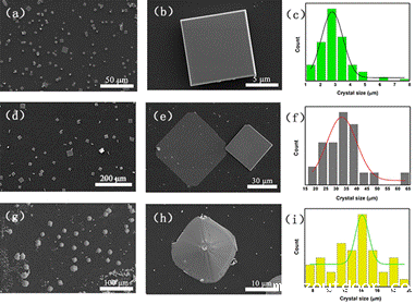 2. (a)(d)(g)分别是在25 °C45 °C55 °C的衬底温度下制备的CsPb2Br5纳米薄片的SEM图像。(b)(e)(h)分别为(a)(d)(g)的不同放大倍数图像。(c)(f)(i)是三种不同温度下的对应的粒度分布直方图。