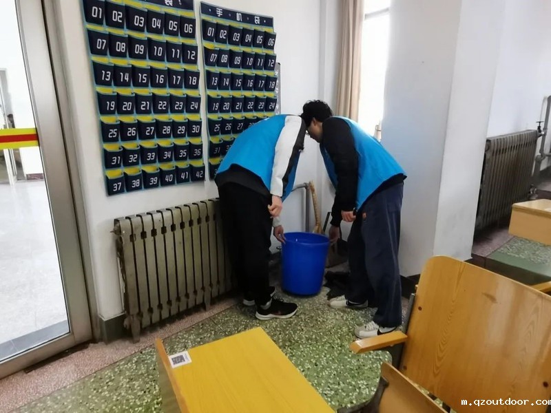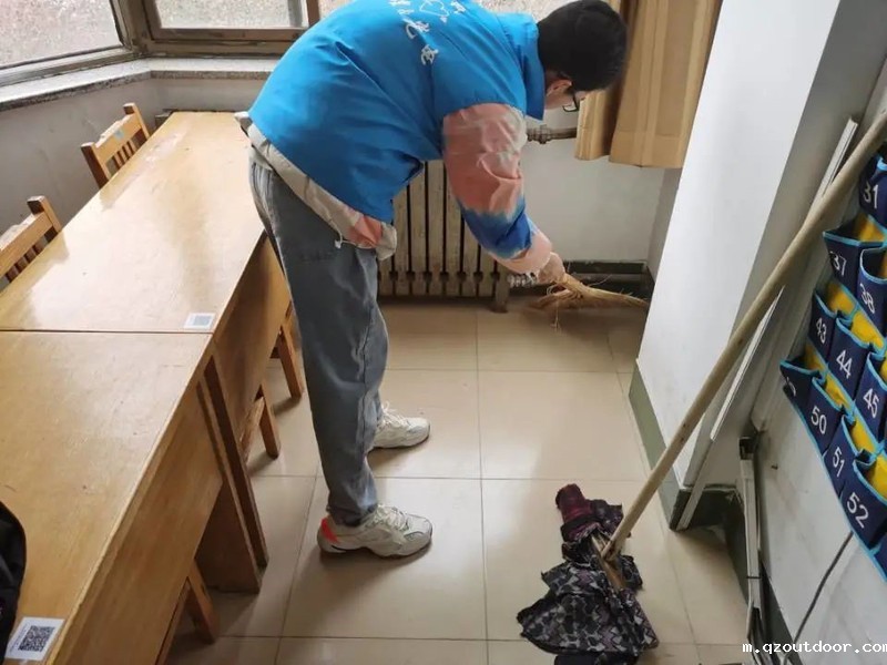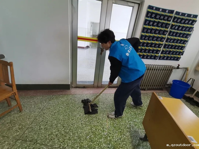志愿者们都在认真的在打扫地面,不放过任何一个角落,为同学们的营造了干净舒适的地面视觉环境。