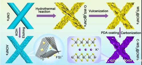研究人员发现,作为支撑骨架和生长模板的碳纳米纤维可以实现WS2纳米片的均匀生长,改善储钾反应动力学,并促进电化学转化反应;碳包覆可缓冲电极充放电过程中的体积膨胀,增加电极导电性。作为钾离子电池负极,该电极材料表现出优异的储钾比容量和倍率性能。基于原位拉曼、原位X射线衍射、非原位透射电镜以及第一性原理计算,阐明了WS2K+的储钾反应机理,即插层反应(WS2KxWS2)和转化反应(KxWS2K2S5W+ K2S)相结合的反应机理。基于该电极材料构建的钾离子电容器表现出180.4 Wh kg-1的能量密度,这是目前国际上报道的最高水平之一。
