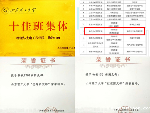 全班平均学分绩点75.84,曾担任主要学生干部12人。在betway亚洲体育官方网站第三届学生会中,部长及以上主要学生干部共15人,其中物教1701班共占有8人。全班累计奖励135项,其中国家级奖励4项,省级奖励26项,校级奖励105项,获得各类奖助学金92人次。四年来,在学院党委、团总支的指导下,物教1701班的班级工作取得了突出的进展:我班荣获山东理工大学“师代先锋”特色团支部、“红旗团支部”、 “优秀团支部”、十佳班集体等荣誉称号。