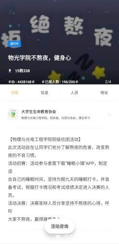 本次活动分为初赛和决赛两个进程,活动初赛采用线上方式进行,活动参与者下载“睡眠小镇”APP,在软件中制定适合自己的睡眠时间,坚持连续九天睡眠打卡。社团相关工作人员根据打卡情况决定进入决赛的人员。活动决赛于11月25日在15号教学楼340教室采用线下方式进行,由焦晓东主持。此次活动决赛结果如下:高春燕、纪洪明、增祥曦等六名活动参与者获得一等奖,张文杰、李佳欣、段惠文等十名活动参与者获得二等奖,苏泓力、张泽良、郭进取等十五名活动参与者获得三等奖。