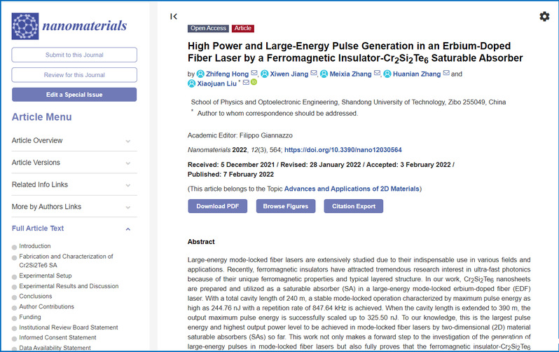 近日,《Nanomaterials》(IF: 5.076)在线报道了我院刘晓娟副教授及合作者在光纤激光技术领域的重要进展。原文链接:https://doi.org/10.3390/nano12030564