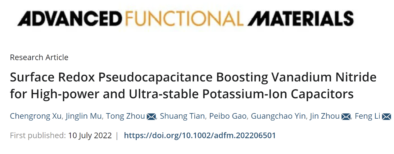 近日,我院2019级硕士研究生许成荣在我院周通副教授、化学化工学院周晋教授和中科院金属研究所李峰研究员共同指导下,在新型储能器件领域取得最新进展,相关成果以“Surface Redox Pseudocapacitance Boosting Vanadium Nitride for High-power and Ultra-stable Potassium-Ion Capacitors”为题,发表在国际知名期刊《Advanced Functional Materials》,许成荣为第一作者。
