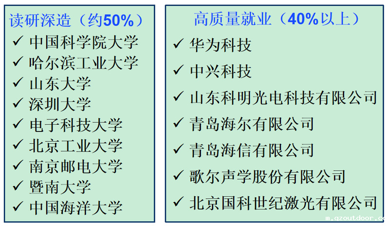 经过系统的培养,本专业本科生展现出了较高的综合能力,学生毕业后能在研究院所、高等院校、信息产业部门、光电企业及其相关领域从事光电仪器设计、光电检测、光电系统集成与设计开发等方面的生产、研发和管理工作,也可以继续攻读光电信息、光学工程、电子技术和通信等领域研究生。