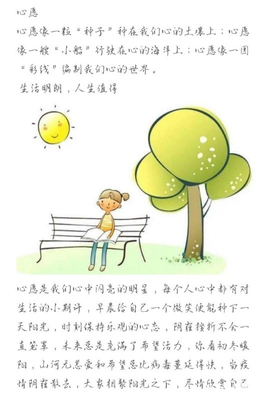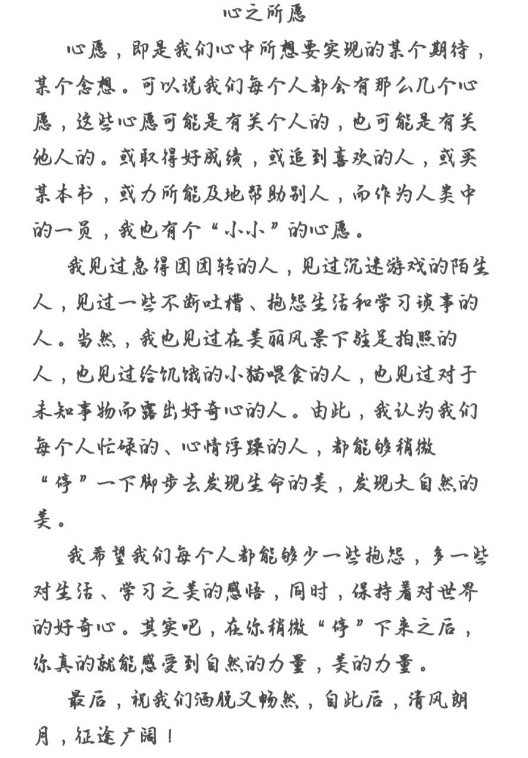 活动以征稿的形式举办,请同学们围绕“心愿”写一篇文章,题材不限,字数不限,可自由发挥,可配以相关图片。留下自己近期或长期的心愿或目标,也可写下对某人的祝福。以下是部分优秀作品节选: