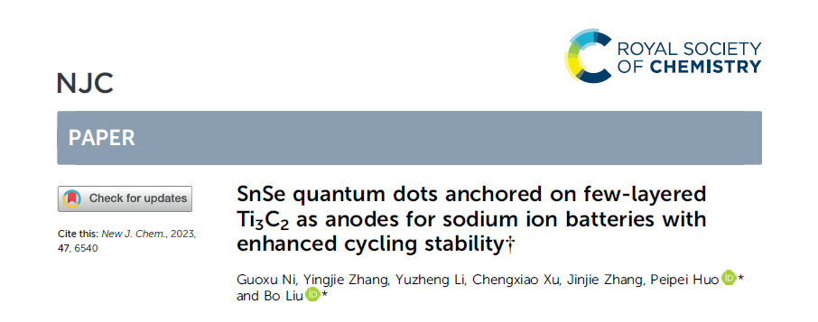 我院霍培培副教授指导研究生倪国旭等人制备SnSe@f-Ti3C2复合材料,并作为钠离子电池的电极材料。尺寸为3-5 nm的0D SnSe量子点均匀地锚定在2D f-Ti3C2纳米片表面。在复合材料中,MXene作为弹性骨架,防止了SnSe在充放电过程中的聚集并缓冲了巨大的体积膨胀,而且加速了电荷载流子的传输。SnSe量子点可以作为层间间隔物,大大提高容量值并抑制f-Ti3C2的重新堆叠。2D f-Ti3C2纳米片和0D SnSe量子点之间有趣的协同效应使SnSe@f-Ti3C2复合材料在0.05 A g-1下具有540 mAh g-1的可逆容量,,并且在0.5 A g-1下循环100次后具有97.79%的容量保留率。