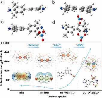 我院牛之慧博士及其合作者报道了一种无定形MnSiO3作为氧化酶,在比色检测生物硫醇的过程中表现出高可靠性和超灵敏度。实验结果表明,无定形结构中高价态锰离子的快速释放赋予了其出色的催化动力学(Km = 17 μMVmax= 0.977×10-8Ms1)和低的检测限(10 nM)。理论计算结果表明,硅酸根离子降低了氧化态底物的溶剂化自由能,提高了酶反应曲线平台的稳定(~10 min)。10 min的可操作时间足以消除个体操作时间差异对检测结果的干扰,提高了体系的可靠性。此外,作者还将体系用于生物样品(血清和细胞)的特异性分析和视觉逻辑门的设计,通过与试剂盒对比进一步评价了体系的可靠性和灵敏度。相关工作以“Stable enzymatic curve platform and ultrafast catalytic kinetic endows MnSiO3 oxidase mimic with high reliability and supersensitivity”为题,发表于国际学术杂志Chemical Engineering Journal上,属中科院一区TOP期刊。