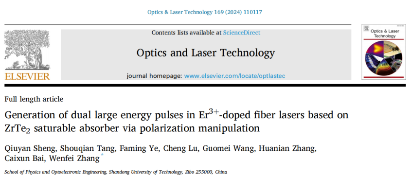 4.“Generation of dual large energy pulses in Er3+ doped fiber lasers based on ZrTe2 saturable absorber via polarization manipulation,”Optics & Laser Technology, 2024, 169: 110117. 该研究以ZrTe2作为可饱和吸收体,实现了大能量脉冲锁模操作。