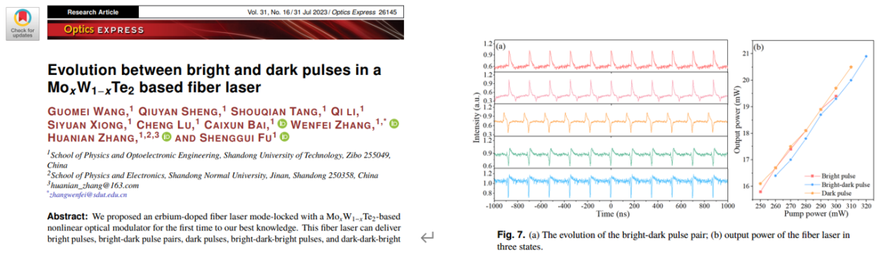 1.“Evolution between bright and dark pulses in a MoxW1−xTe2 based fiber laser,” Optics Express, 2023, 31(16): 26145-26155. 该研究以MoxW1−xTe2作为可饱和吸收体,发现适当提高输出能量的比例可以提高光纤激光器产生暗脉冲的几率。并实现了在光纤激光器中亮脉冲、明暗脉冲对和暗脉冲之间相互演化。
