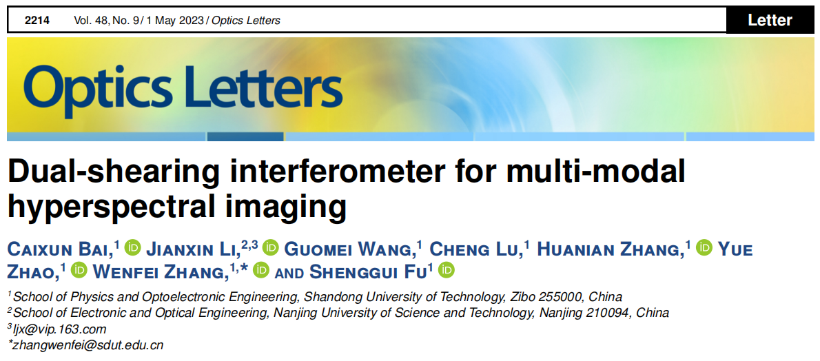 7.“Dual-shearing interferometer for multi-modal hyperspectral imaging,” Optics Letters, 2023, 48(9): 2214-2217. 设计了一种用于多模态高光谱成像的双剪切干涉,同时对目标进行光谱和偏振成像。