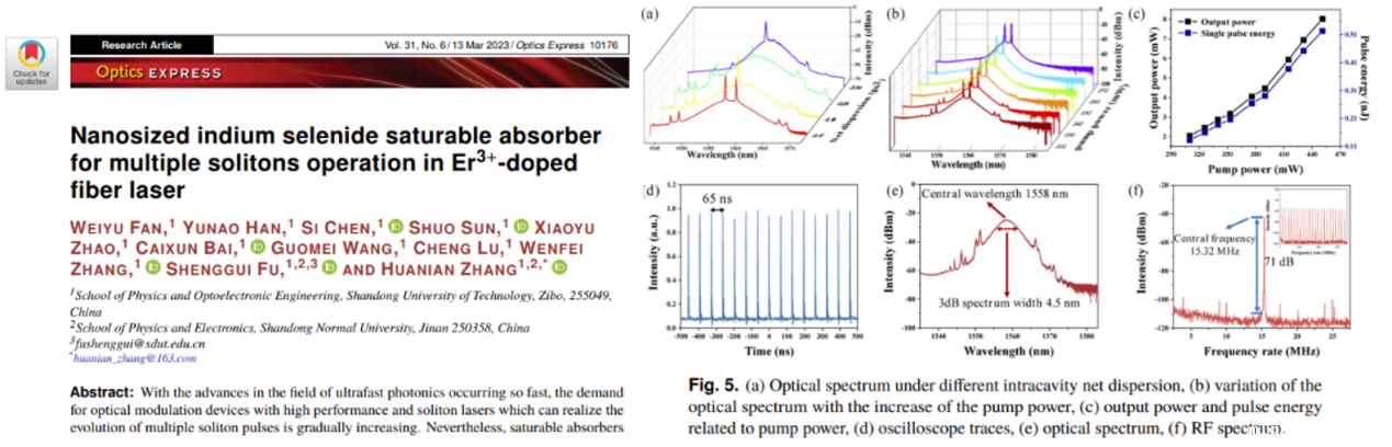 2.“Nanosized indium selenide saturable absorber for multiple solitons operation in Er3+-doped fiber laser,” Optics Express, 2023, 31(6): 10176-10190. 该研究以InSe作为可饱和吸收体,利用色散管理技术在光纤激光器中获得了多种孤子脉冲状态。