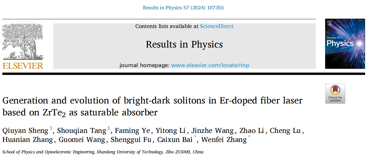 5.“Generation and evolution of bright-dark solitons in Er-doped fiber laser based on ZrTe2 as saturable absorber,” Results in Physics, 2024, 57: 107355. 该研究以ZrTe2为饱和吸收体,实现了亮孤子、亮-暗孤子对和暗孤子三种双波长锁模操作。