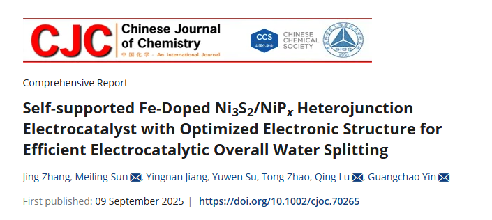 近日,我院孙美玲副教授、芦庆博士指导研究生在电催化全水解研究方面取得重要进展,相关研究成果以题为“Self-supported Fe-doped Ni3S2/NiPx heterojunction electrocatalyst with optimized electronic structure for efficient electrocatalytic overall water splitting”的论文形式发表于国际知名综合性期刊《Chinese Journal of Chemistry》(中科院一区TOPIF=5.5)。我院23级研究生张靖为第一作者,孙美玲副教授、芦庆博士与尹广超教授为共同通讯作者,我院为第一通讯单位。